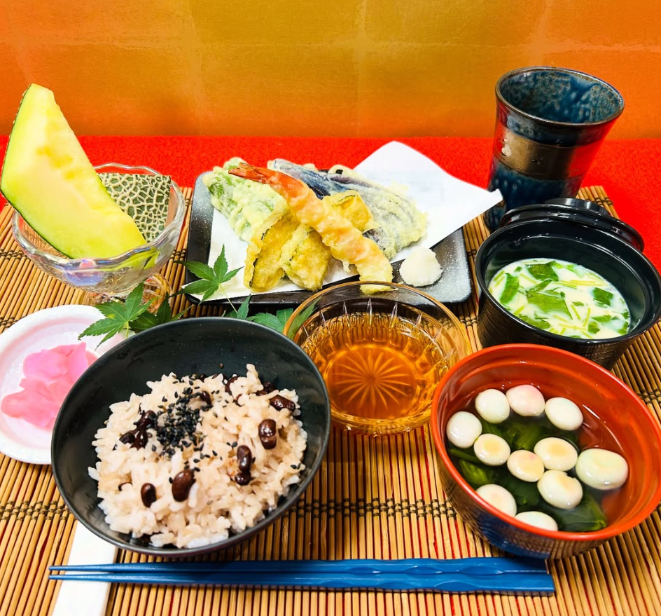 献立は、ふっくらと炊き上げた「お赤飯」を主食に、彩りも豊かな「天ぷらの盛り合わせ」、出汁の効いた「茶碗蒸し」、やさしい味わいの「お吸い物」、そしてデザートにはみずみずしい「メロン」を添え、季節を感じる華やかな内容となりました。