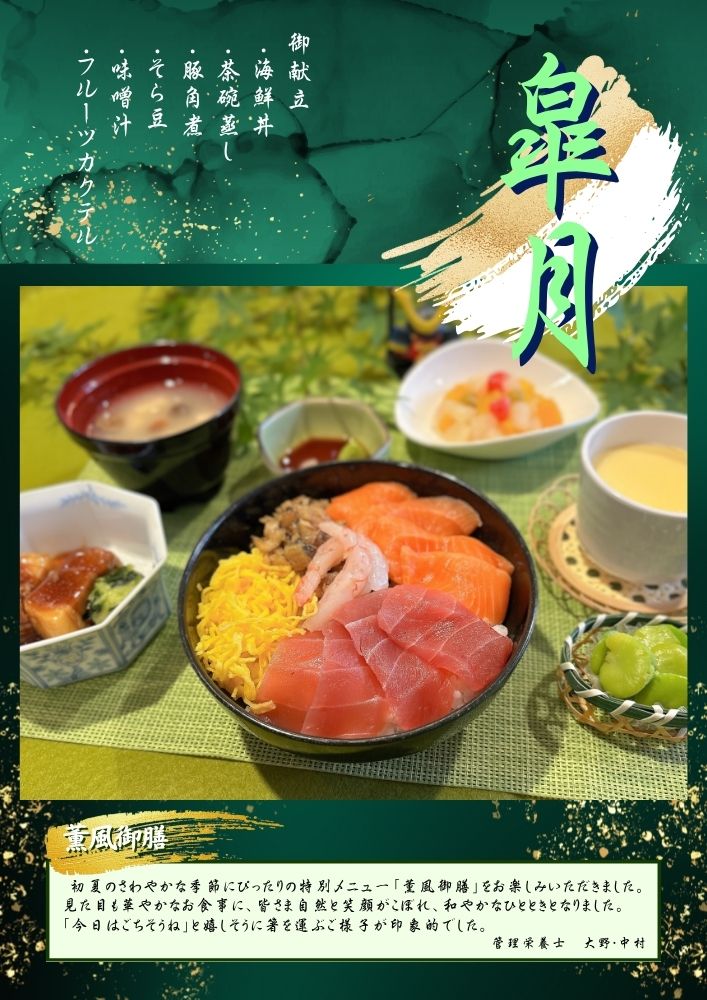 月の行事食として「薫風御膳(くんぷうごぜん)」をお楽しみいただきました。 爽やかな初夏の風を感じる季節にふさわしい、彩り豊かで上品な御膳に、皆さまからも笑顔がこぼれました。 毎月の行事食は、下記ページでご紹介しています。ぜひご覧ください。