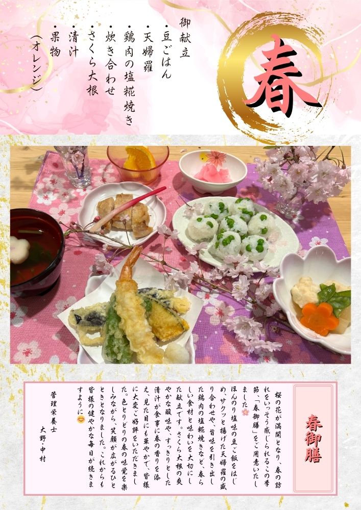 春の訪れを感じていただける特別メニュー「春御膳」をご提供しました。 旬の食材を使った彩り豊かな料理に、皆さまから「きれいね」「春らしいね」と笑顔がこぼれました。 毎月の行事食は、下記ページでご紹介しています。ぜひご覧ください。