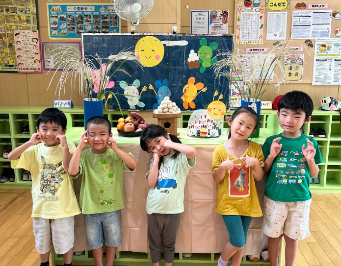 玄関前に、ススキや秋の野菜や果物と一緒に飾ると、他のクラスのお友達も興味深々で、「お団子いっぱ〜い!」と嬉しそうにお父さんやお母さんと見ている姿も見られましたよ!