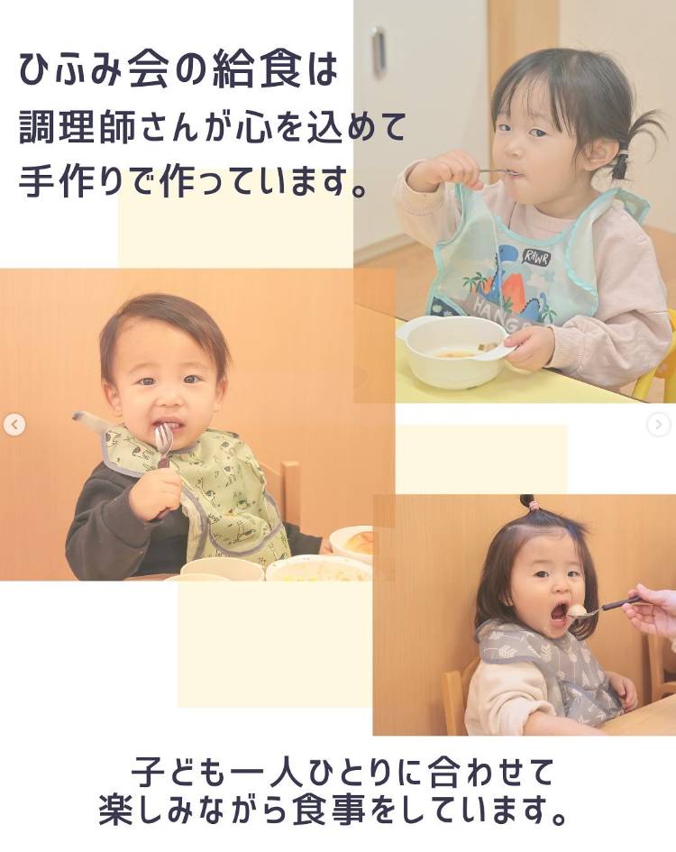 ひふみ会の給食は、調理師さんが心を込めてすべて手作り。栄養バランスはもちろんのこと、子どもたちが「食べることって楽しい!」と感じられるよう、一人ひとりのペースに合わせて丁寧に提供しています。
