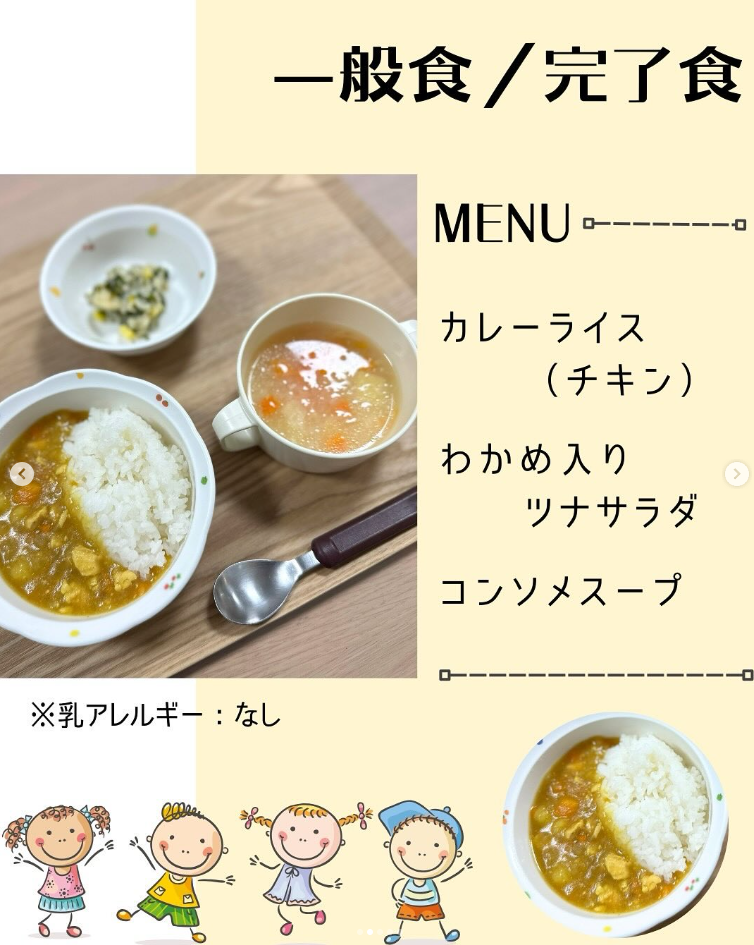 この日のメニューは子どもたちに大人気のカレーライス(チキン)に、わかめ入りツナサラダ、そしてコンソメスープの組み合わせ。おやつには牛乳とメロンパン風クッキーをご用意しました。