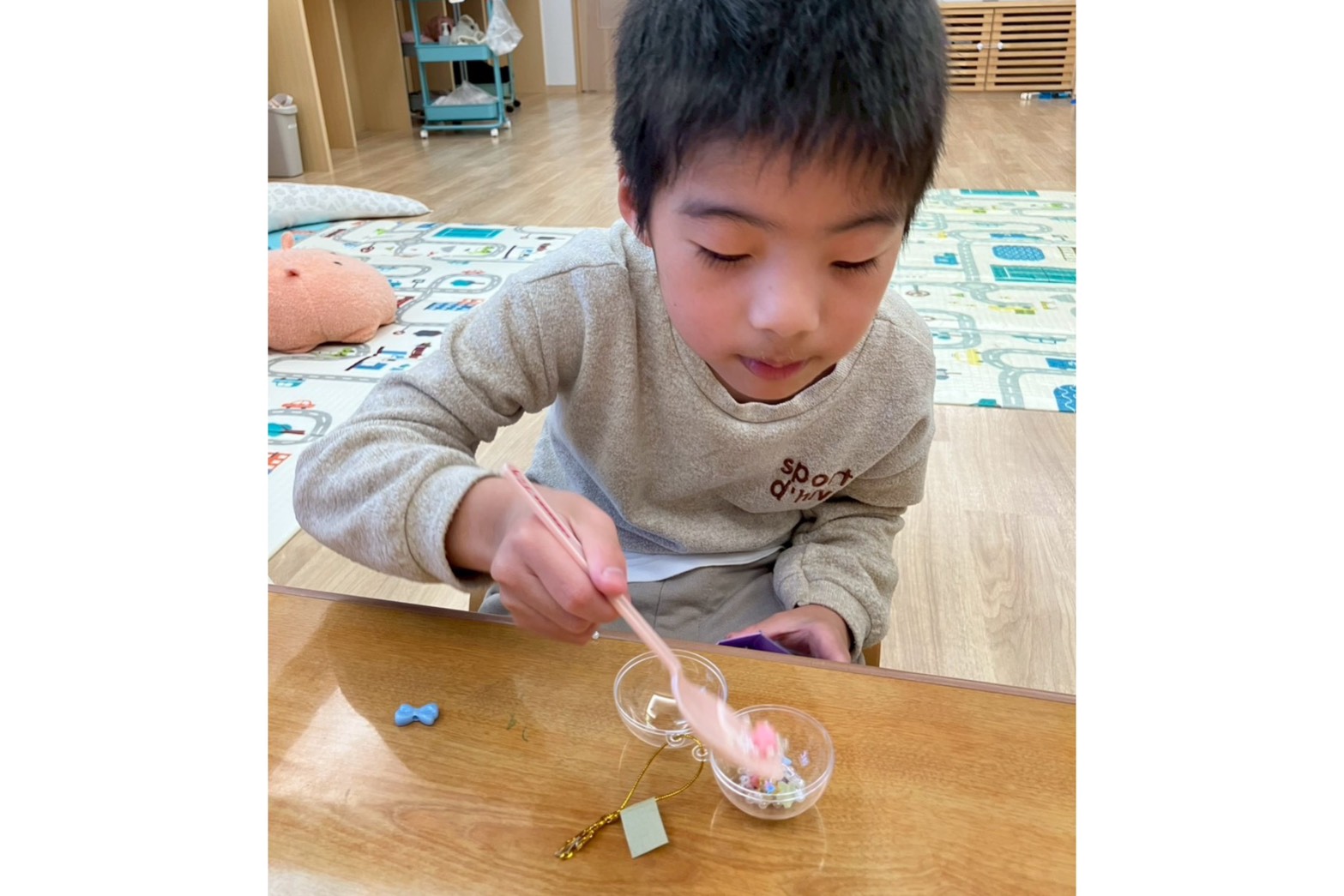 スプーンでビーズを運んで蓋を閉じ、最後はシールを貼って楽しみました!