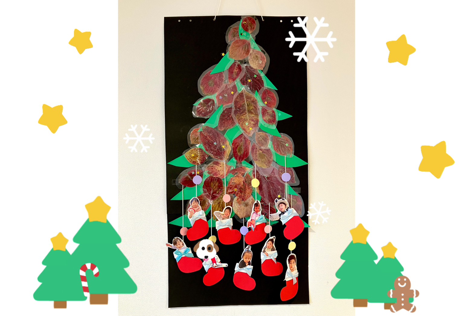 1枚目はお散歩に行った時に拾った落ち葉をクリスマスツリーに見立て、