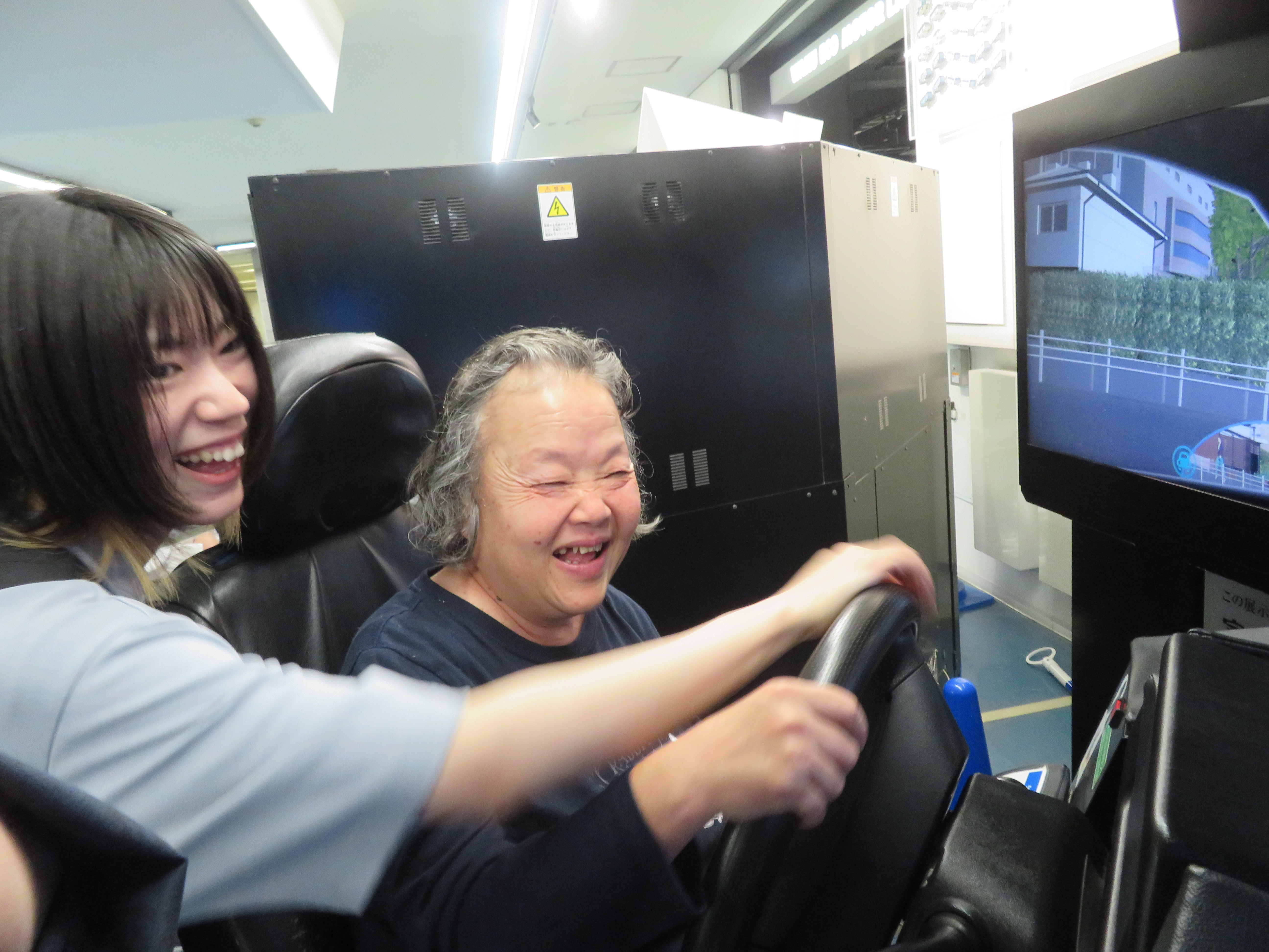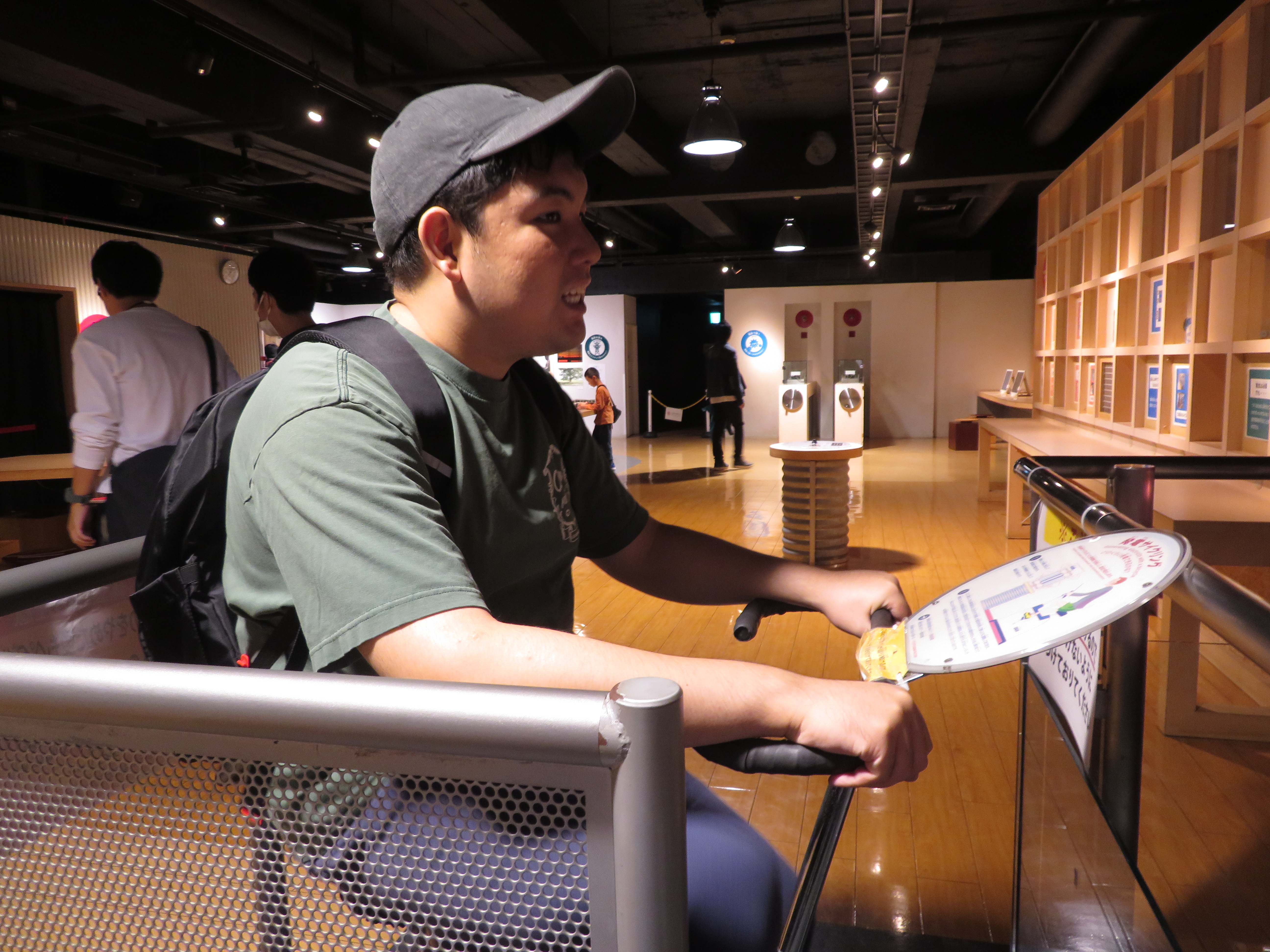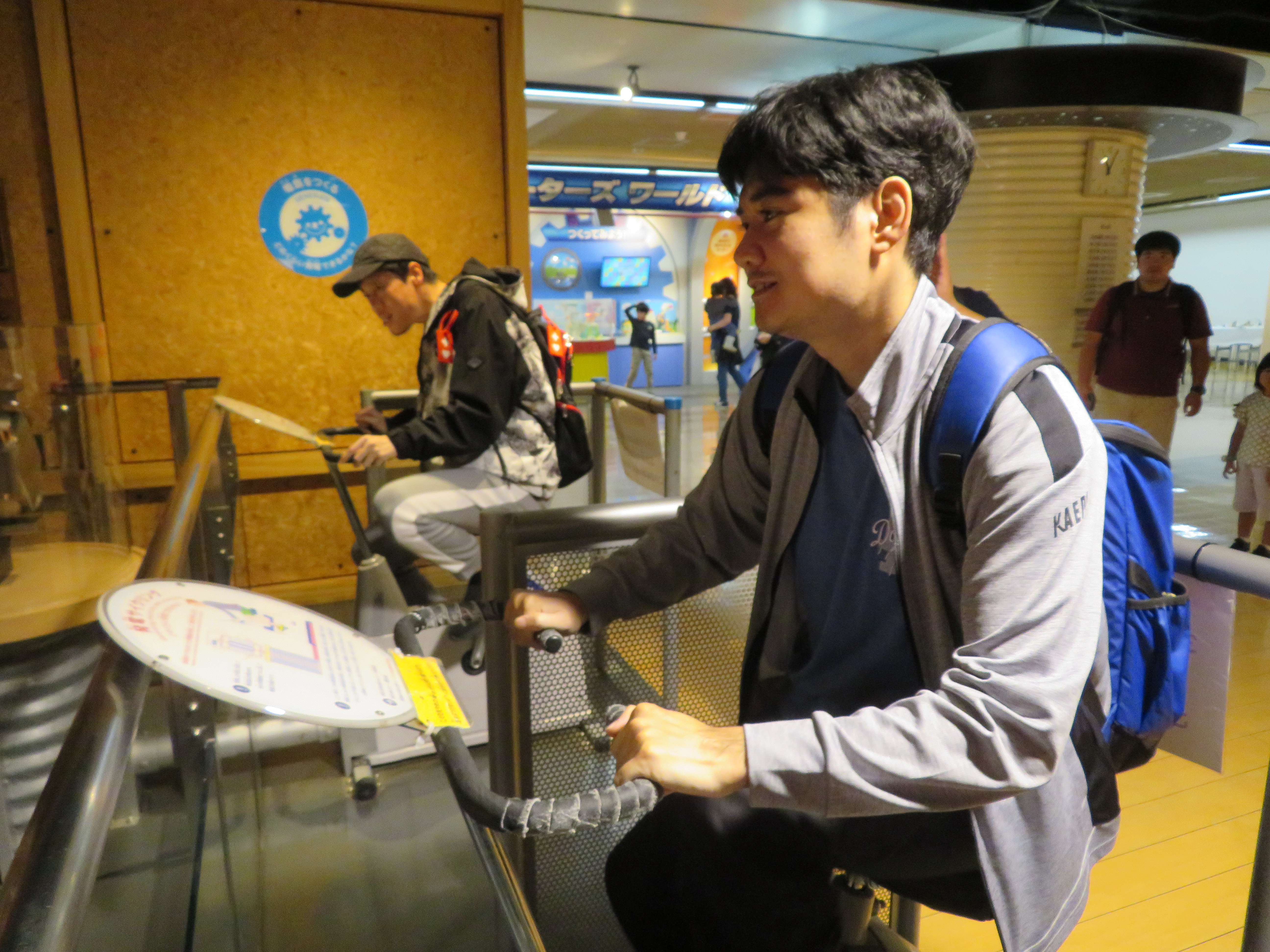 技術館では、自動車の運転体験や自転車で発電、大きいシャボン玉の中に入ったり色々な体験をしました。